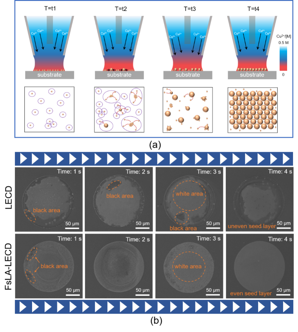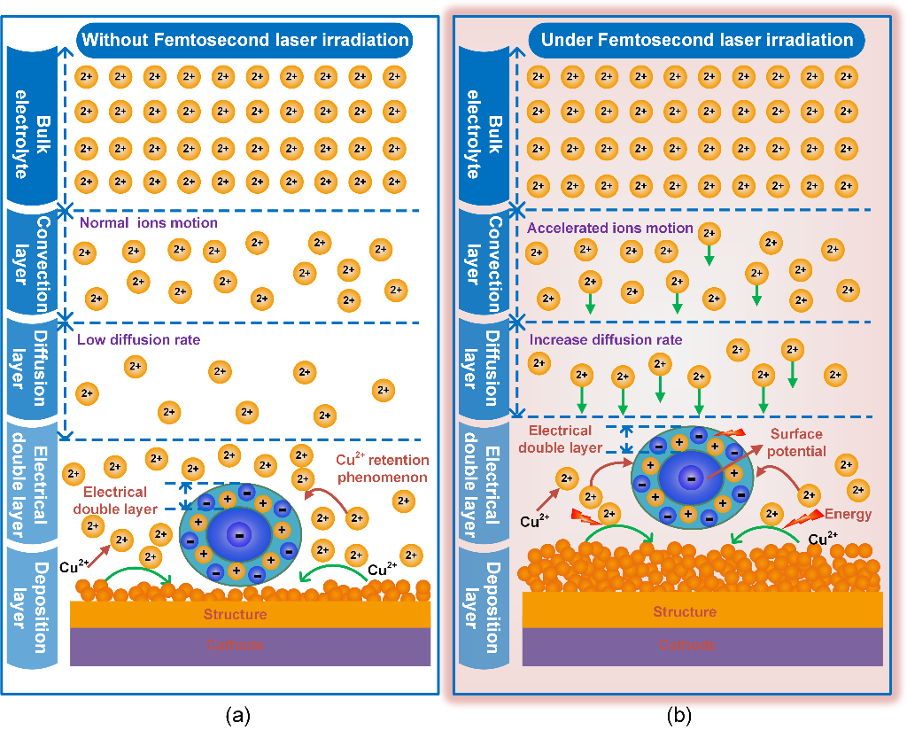 3 a)传统 LECD:反应界面离子消耗快,离子补给不足导致沉积慢;(bFsLA-LECD:激光诱导温度梯度产生Marangoni效应,加速离子向界面迁移;同时激光作用降低反应活化能,促进电子与铜离子结合,反应速率显著提升