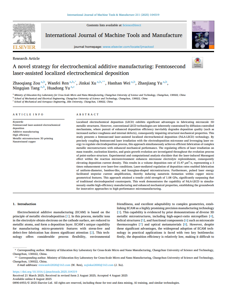 近日,机电工程学院跨尺度微纳制造教育部重点实验室许金凯教授团队,在机械制造领域国际顶级期刊International Journal of Machine Tools and ManufactureIJMTM,中科院一区,IF=18.8)上发表题为“A novel strategy for electrochemical additive manufacturing: Femtosecond laser-assisted localized electrochemical deposition”的研究类论文,该期刊在学术界具有极高的影响力,2024年度全球接稿量仅49篇。长春理工大学为第一通讯单位,机电工程学院博士研究生邹兆强为论文的第一作者,学院任万飞老师和许金凯老师为论文的共同通讯作者。