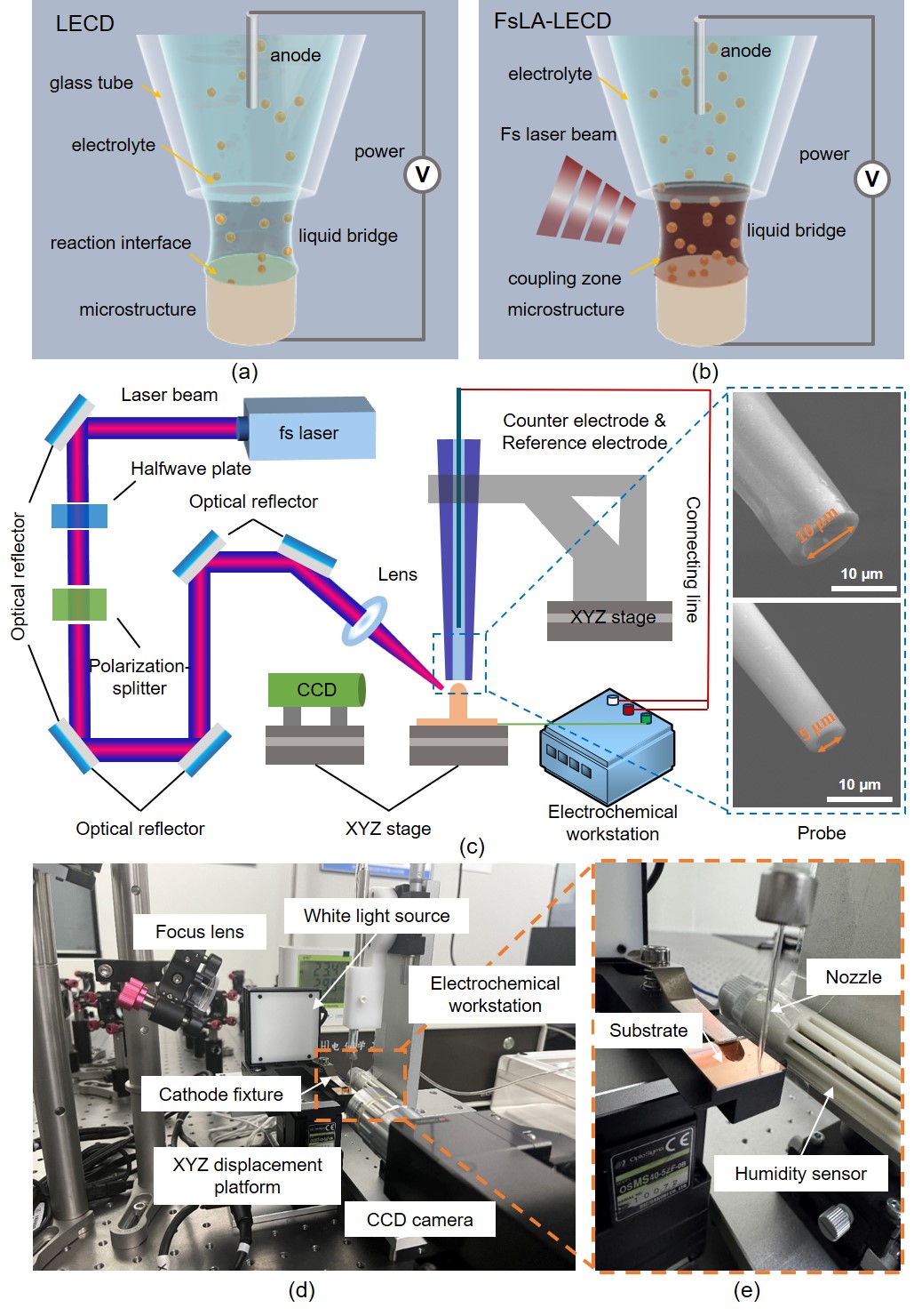 图2 (a)传统 LECD 原理:仅通过电场驱动离子在阴极还原,离子扩散慢;(b)FsLA-LECD 原理:飞秒激光聚焦于阴极/电解液界面,与电场协同作用;(c)实验装置原理图;(d)实验装置实物图;(e)喷嘴与基底局部放大图