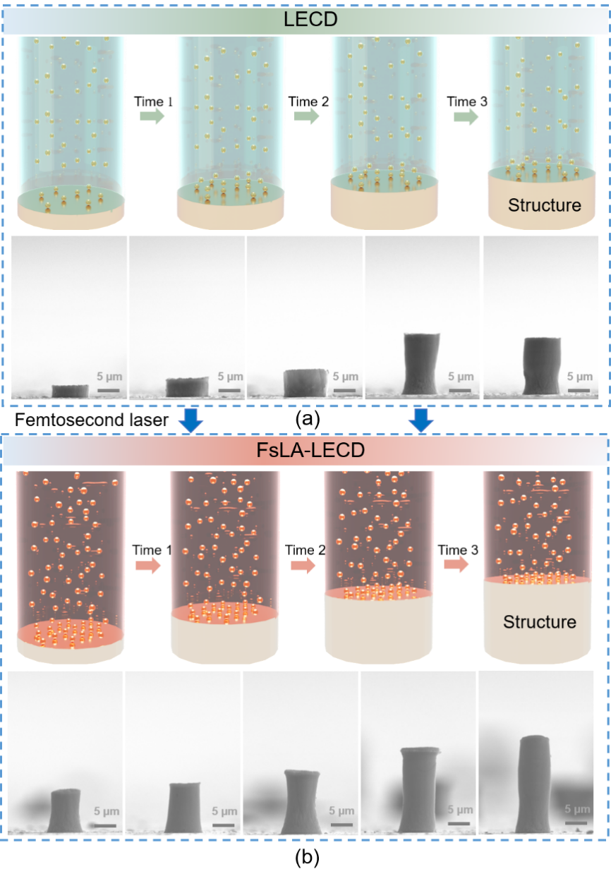 6 面-结构形成过程的微观结构形成实验图像。(a) LECD的表面-结构形成过程。(b) FsLA-LECD的表面-结构形成过程。在激光作用下,反应区内金属离子运动速度加快,促进了传质过程和电化学还原反应。
