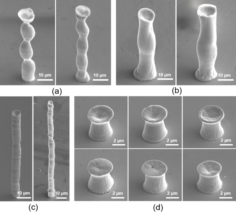 11 复杂铜微几何特征的制备。(a) 竹节状结构;(b) 变直径结构;(c) 高深宽比微柱;(d) 沙漏形结构