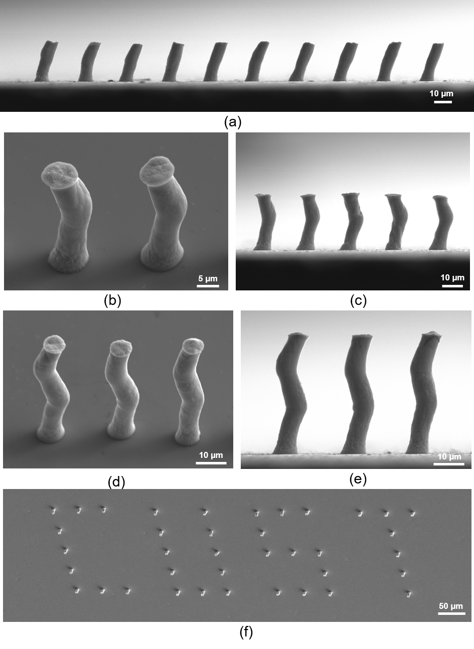 10 FsLA-LECD技术制备结构的SEM图像。(a) 倾斜角为70º的结构阵列;(b) 双悬空结构阵列的45º视角图;(c) 双悬空结构阵列的前视图;(d) 复合结构的45º视角图;(e) 复合结构的前视图;(f) 由微柱阵列构成的“CUST”字母结构